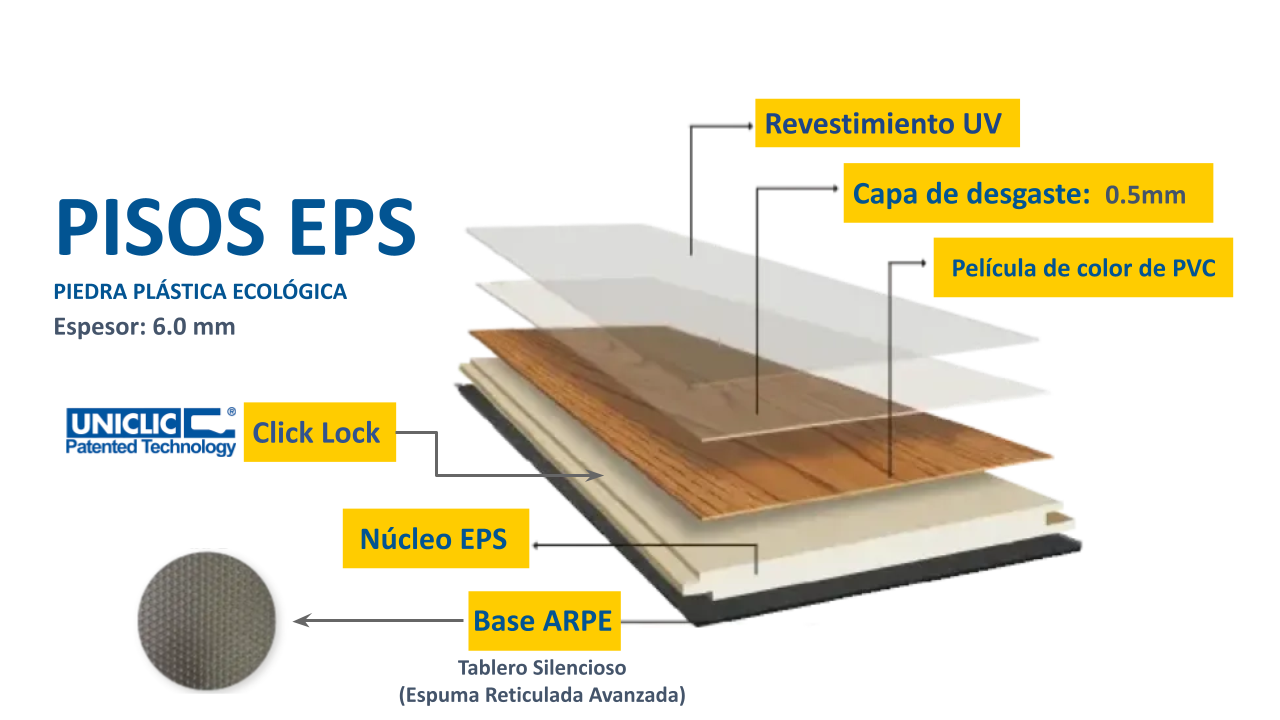 Los suelos SPC-EPS están compuestos principalmente por un recubrimiento UV, una capa resistente al desgaste, una película de PVC coloreado, un tablero central con tecnología EPS y una base de caucho aislante ARPE.